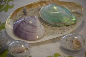In the photo above I filled some clear Easter eggs with sand and shells.  I also place two of our more decorative shells into a larger one with some sand.  The colorful shells almost look like Easter eggs themselves.