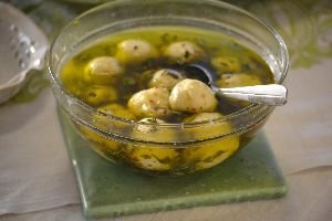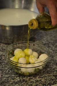 Now pour over the mozzarella balls and marinade ingredients, the olive oil.