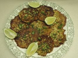Heat a few tablespoons of oil in a large frying pan and drop heaped spoonfuls of the mixture in the hot oil, flattening the little cakes down with the back of the spoon as you go.  Cook these little patties for about 2 minutes each side until golden, and then transfer to a couple of waiting plates lined with paper towels.
