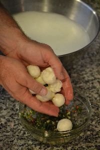 You can also place the cheese into the hot water and it will heat the cheese like the microwave does and then kneed the cheese as before. You can also pull it long forcing it through your hand into a ball.  You may need to place the cheese back into the microwave or hot water to make the cheese more pliable while handling it.
