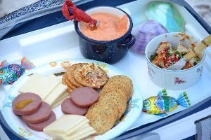Cheese, crackers, turkey sausage with mustard, roasted red pepper dip, baked herbed goat cheese, delicious!!!