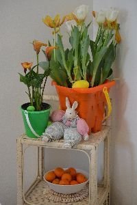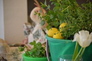 We brought with us buckets of herbs from our garden at home to eat with our Easter dinner.  I even added some tulips and calla lilies to some beach buckets.  One of the pots had split so I had to put the tulips into another container so I improvised.