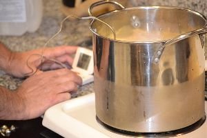 Pour milk into large pot.  Place cooking thermometer into pot.