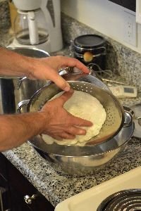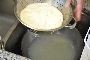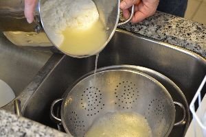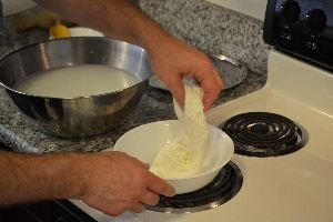 Pour the cheese into a colander with a larger bowl underneath to catch the whey.