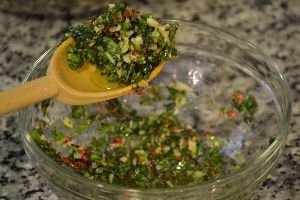 Put the chopped scallions in a bowl and crumble in the feta.  Stir in the chopped parsley and mint, along with the dried mint and paprika.  Add the flour and season well with salt and pepper.  Gradually add the beaten egg and mix thoroughly before stirring in the drained, grated zucchini.  Don’t be alarmed by the unflowing straggly lumpiness of this batter; It’s meant to be this way.