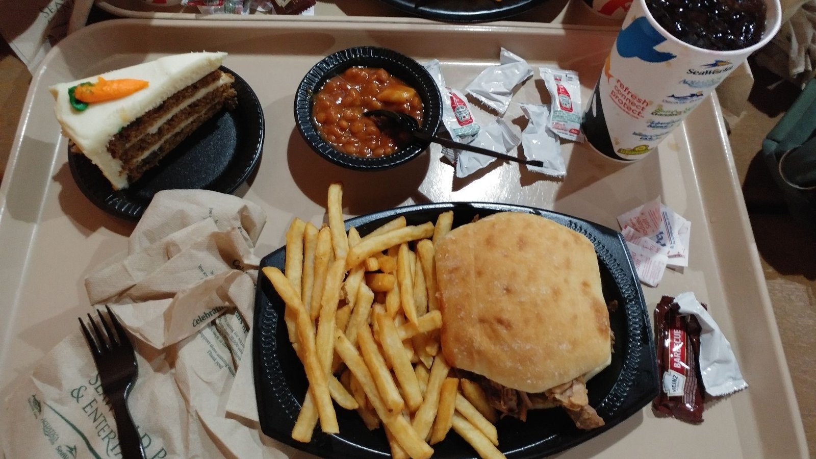 First of all, this is our kind of food. We love Pulled Pork Sandwiches, Baked Beans, French Fries….