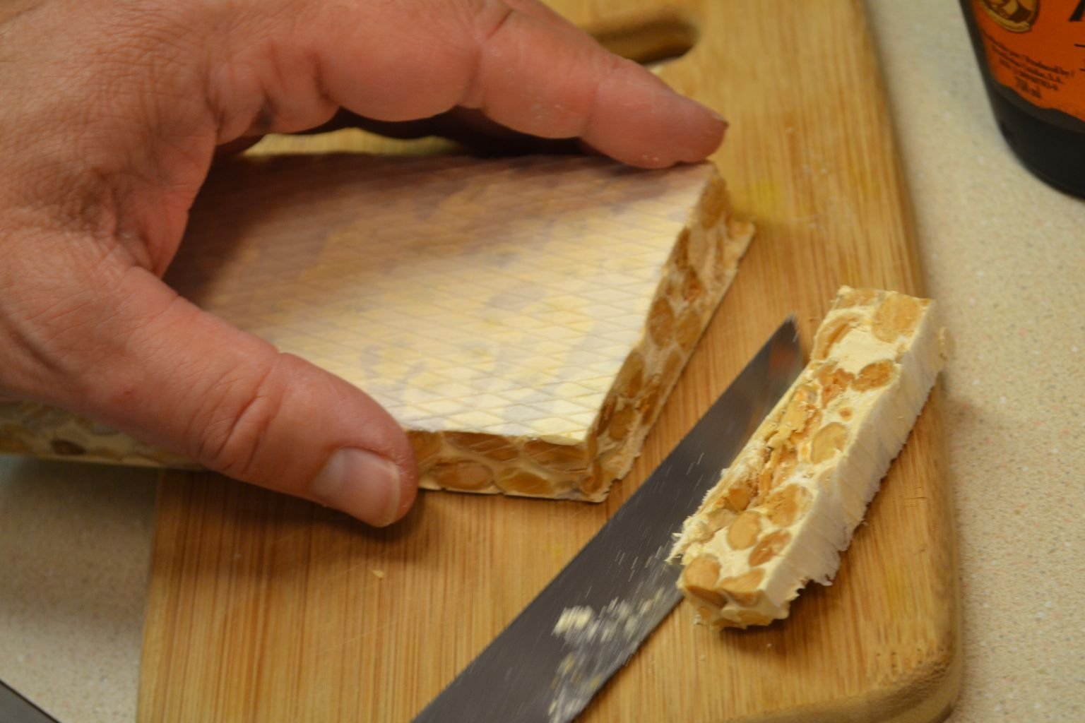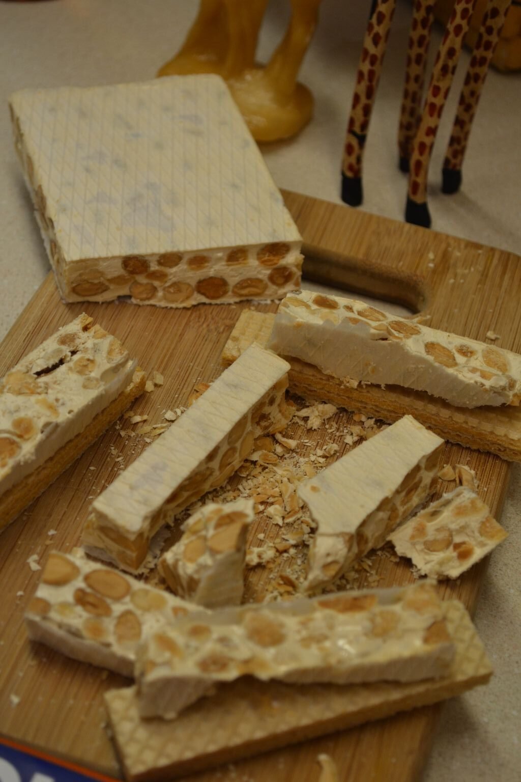 You can really see the giraffe color pattern in the almond nougat once I cut it.
