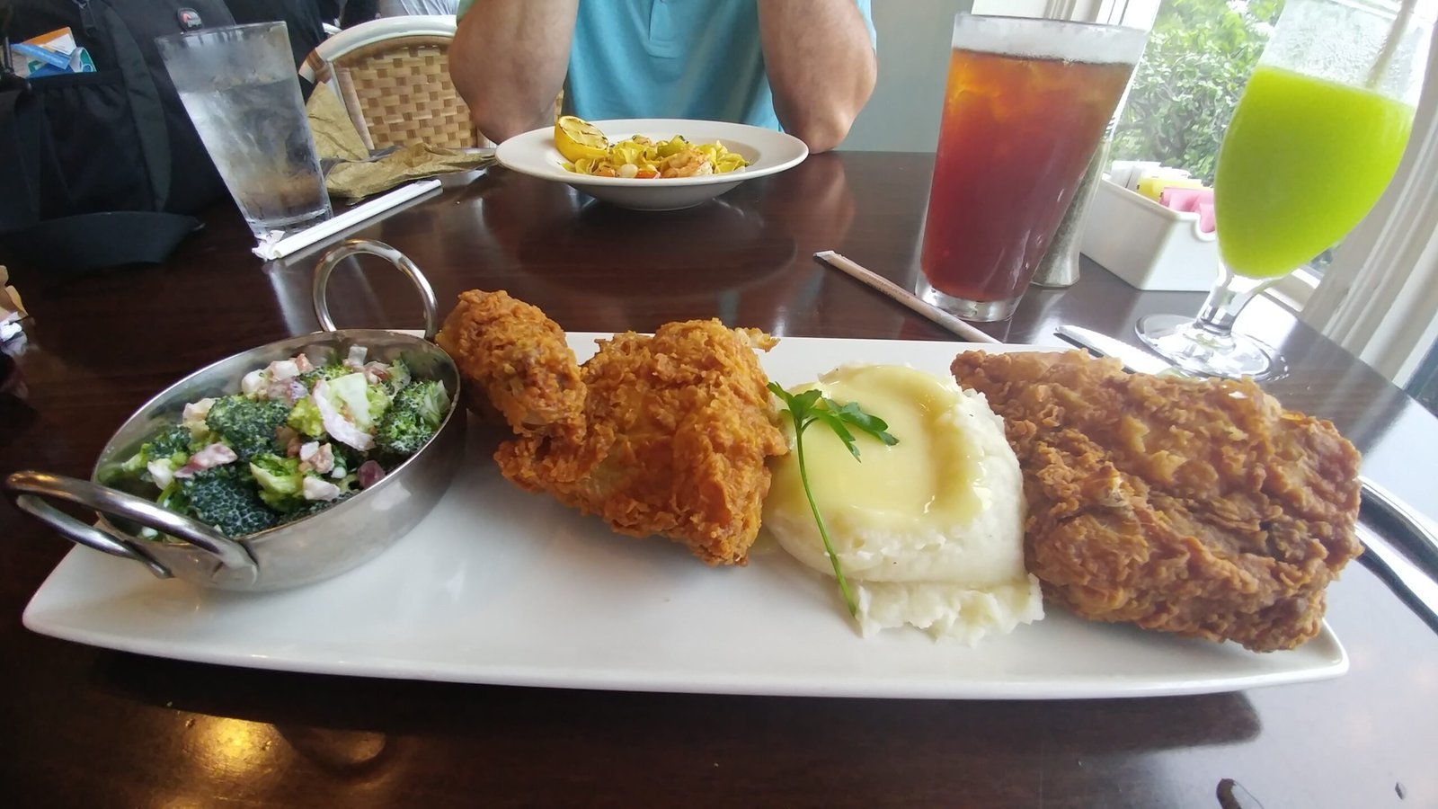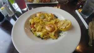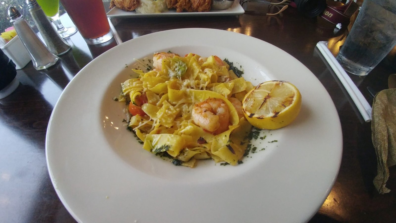 I did enjoy my Fried Chicken with Mashed Potatoes and Gravy. (As a southern girl I can tell you this gravy was not impressive, but the chicken was!) And Gordon enjoyed the Shrimp Pasta.