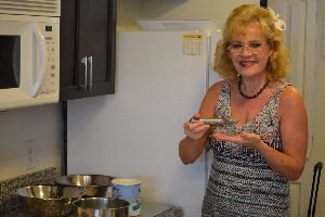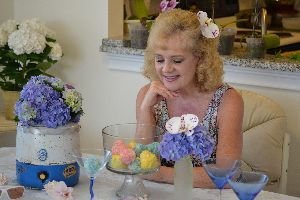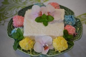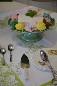 I put this together myself. The white coconut cake in the center is a Pepperidge Farm cake that I bought frozen at the commissary. This cake is a vintage memory to me. My Grandmother loved this cake and I grew up with her always having one in the freezer. So whenever I eat one I always think of her and how much she loved them. The yellow, pink and blue balls above are sugar free vanilla ice cream that I formed into balls and then rolled in coconut that I added food coloring to.