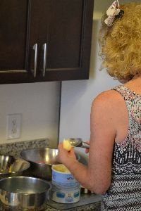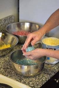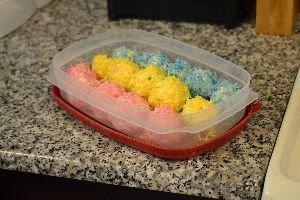 Forming the ice cream into balls and rolling them in colored coconut. This was my Mother’s Day dessert. Ice cream balls rolled into different colored coconut. Then put them in the freezer.