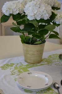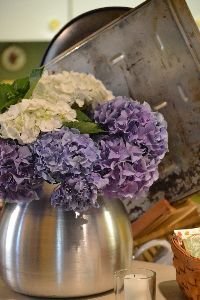 You know, I love hydrangeas. They are so beautiful and fluffy, they kind of remind me of ice cream. I do tend to buy a lot of them during the spring and early summer. I cut off their blooms and place them in water to enjoy in my kitchen. Above I have some in a container I bought at the Asian supermarket. I have no Earthly idea what the container is used for, it was in the cooking section, but I loved the shape of it and had to have it.