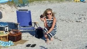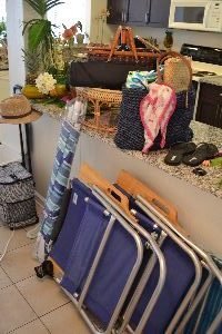 Picnic Basket, Beach Chairs, Beach Umbrella, Cooler, Mini Table, Flip Flops, Beach Bag…..