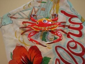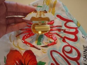 This was a beautiful vintage find for me! Such a lovely scarf. My little red crab looks very nice with it as well. He even houses a little message inside.