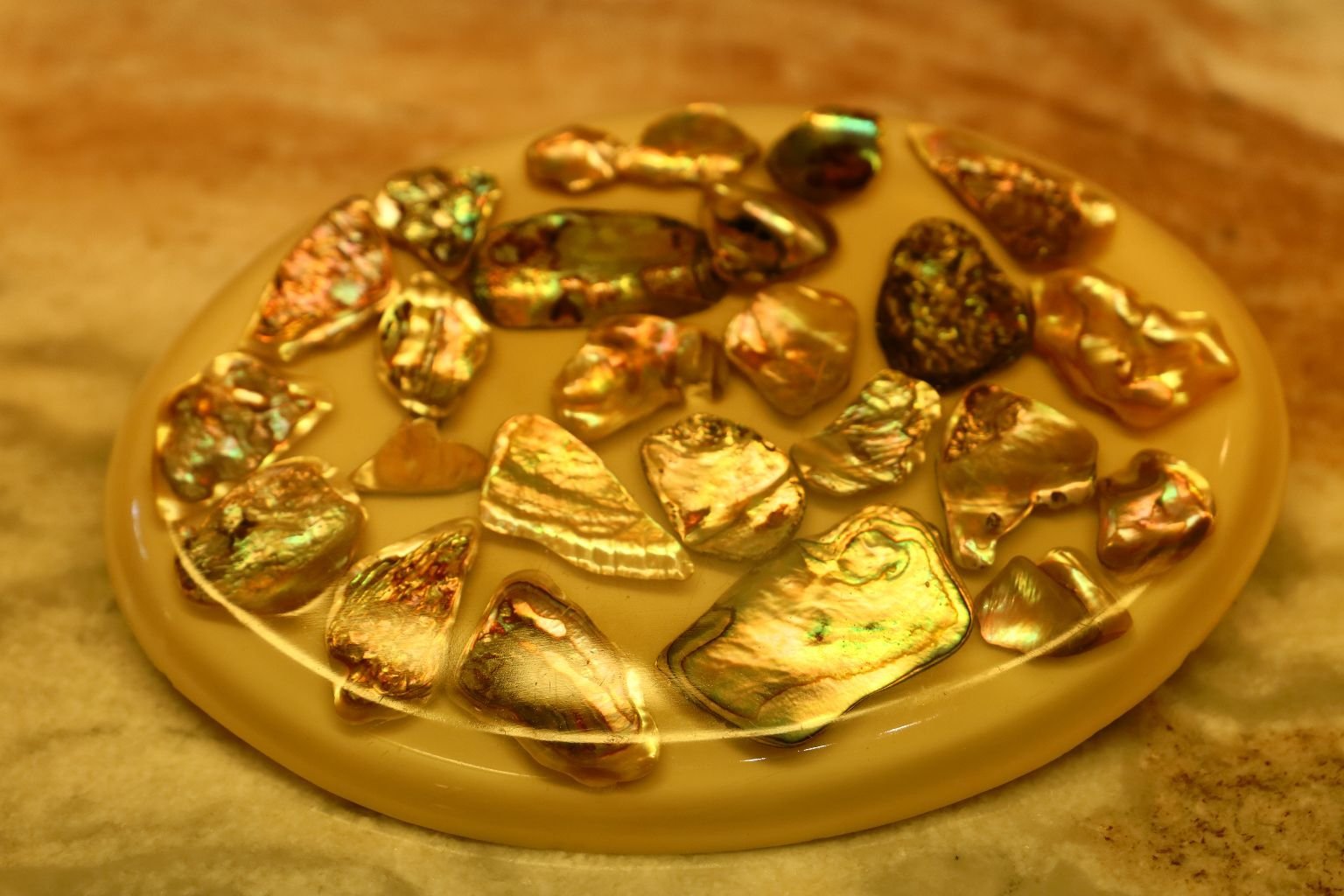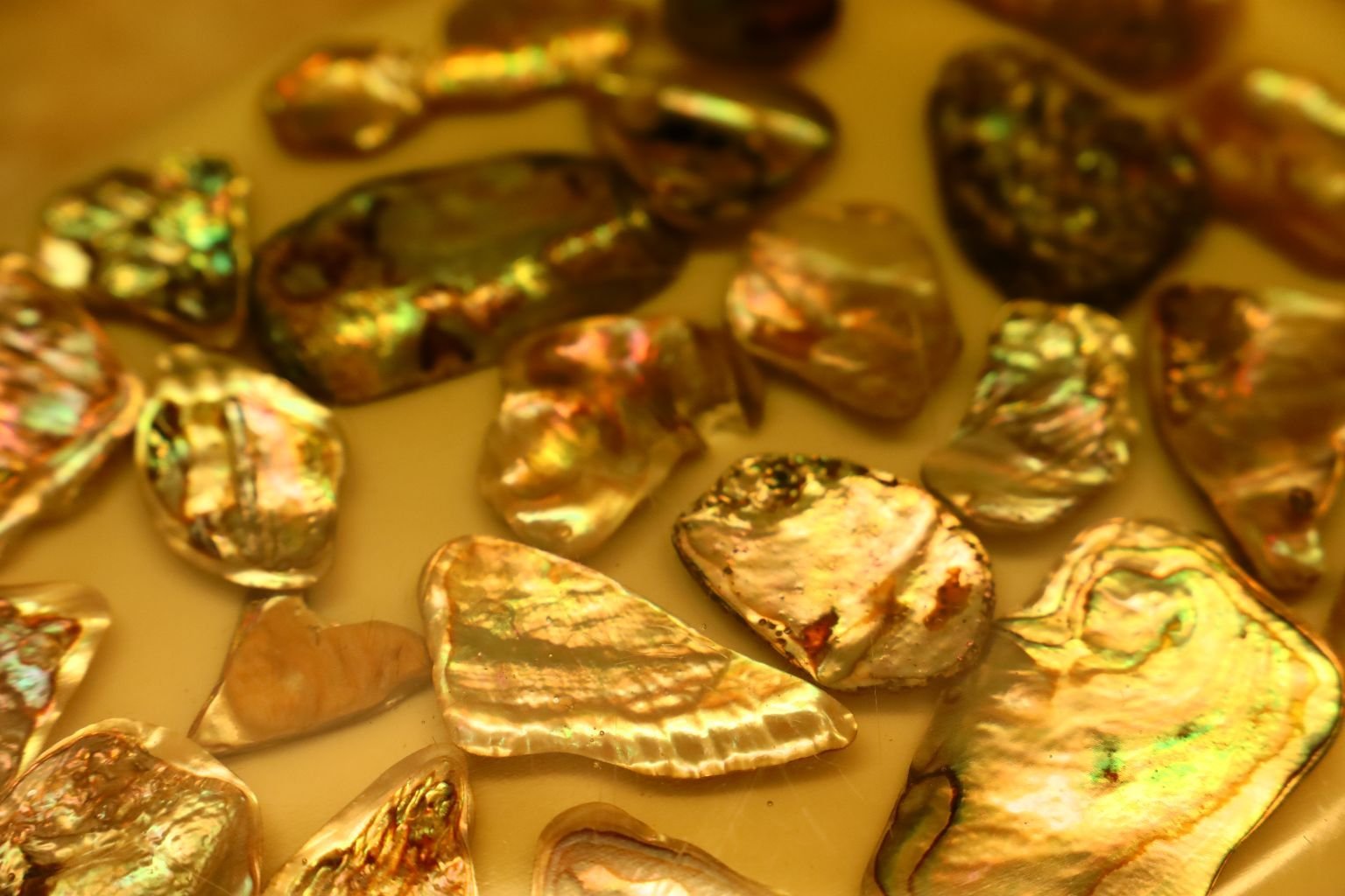 This is something that you would have bought at a souvenir stand on your way down to Florida in the 50’s and 60’s. The shells are actually broken pieces from an abalone shell. They spaced them apart and placed them into this trivet mold. I love it!