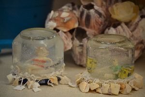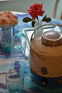 These are my “Sand Globes” that I made a few years ago. I call them sand globes because they are a beachy theme with teenagers and beer cans that are vintage birthday cake toppers that I found at a thrift store. The shells that you see surrounding them at their base are hair scrunchies.