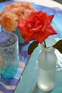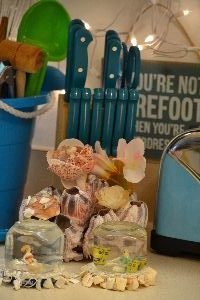 I have an assortment of beach buckets that I keep in the garage so it was easy to think of this as a kitchen utensil holder to add to my beachy kitchen. I did buy some new blue spoons, whisks, ladles, and even some blue knives. I also included some of our beach shovels as well.