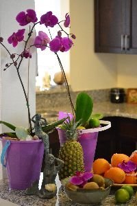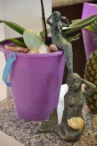 I love colorful beach buckets. They look so casual and fun. I tend to use them for a variety of reasons but here I’ve put some orchids and seashells and even some fruit inside.