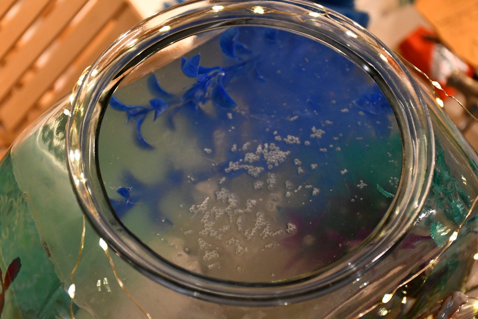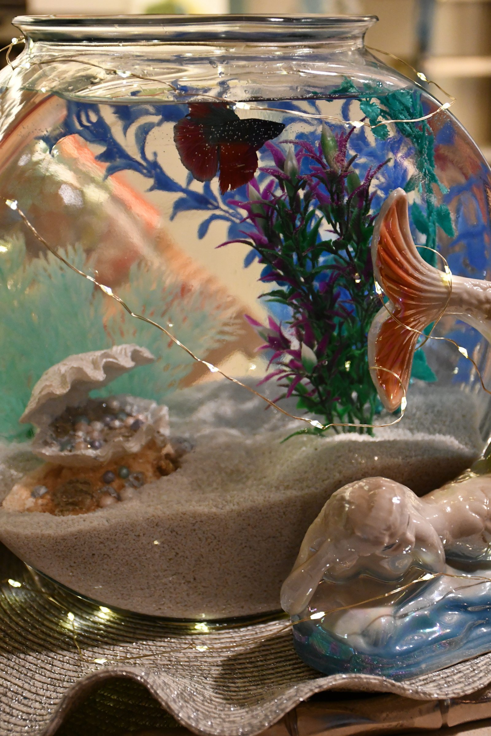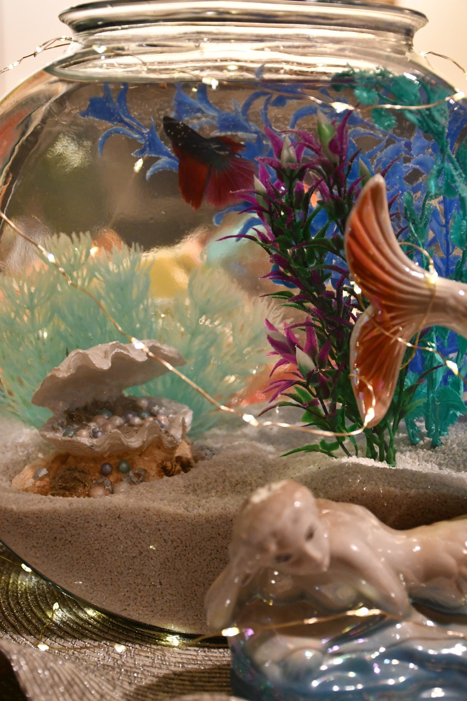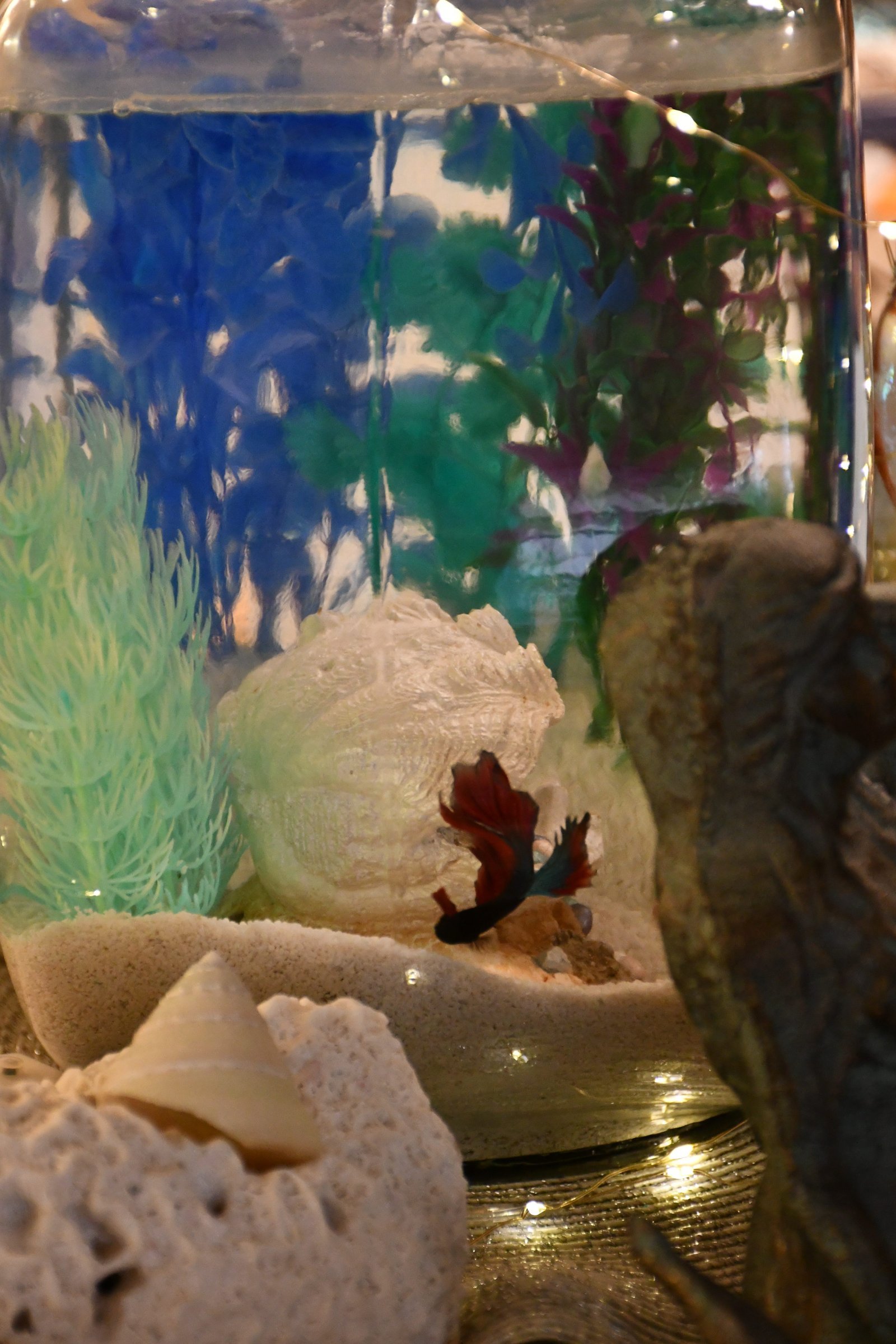 My son-in-law has a lot of knowledge about betta’s and I talked to him about why my betta’s were dying? He told me that a good source of bacteria for them lives in the sand at the bottom of the bowl, and to not thoroughly clean that sand. Just dump the water out of the bowl and whatever gunk doesn’t drain out of the bowl then just pick it out and then leave the sand as is. Then add the new water, rinse the plants and other items in the bowl with just water, place them back inside, add the water softening drops, place Miranda in the cup to bob up and down until she has acclimated to the new water temperature for about 20 minutes, then dump her back in and she should be fine. (Or rather, the next Miranda should be just fine.) 🙂