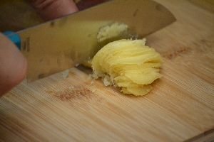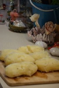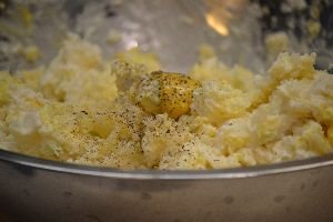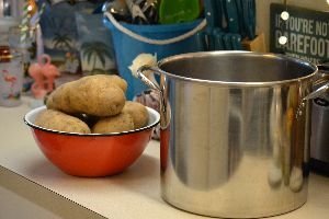 As always, Idaho Potatoes, shaved of their skins and boiled to tender on the stove top with a little bit of salt in the water.