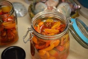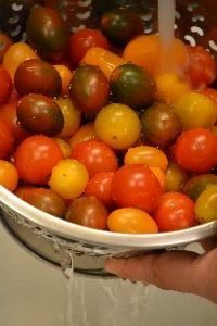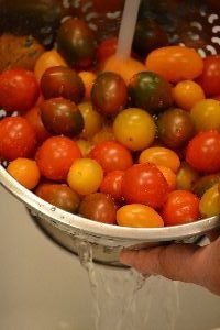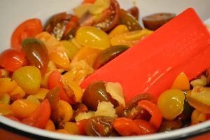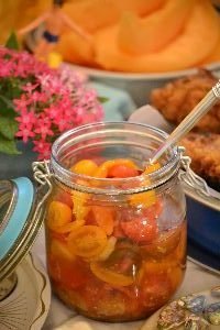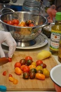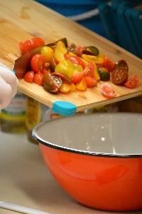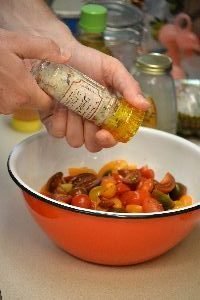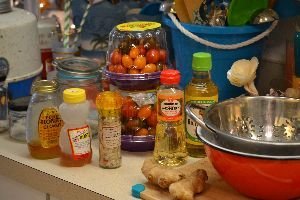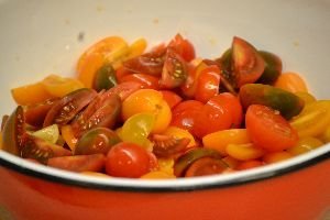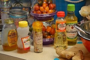 (I had an idea for a tomato salad that I wanted Gordon to make as an addition to our picnic foods. I didn’t know exactly what I wanted but I told Gordon to add some ginger and honey and just go from there. He did! And it was so good!)