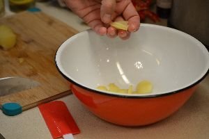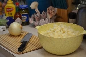 Once the Potatoes have cooled, chop into small bite sized chunks and add to a bowl.