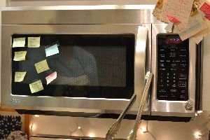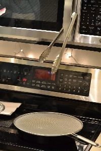 You can hang the tongs over the handle of the microwave,like Julie does. 🙂