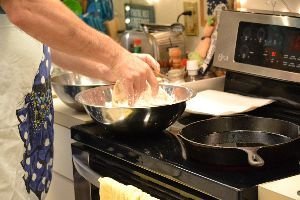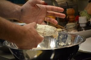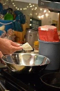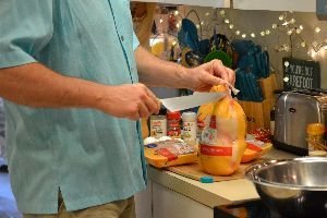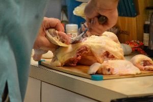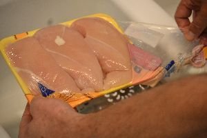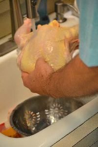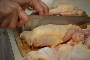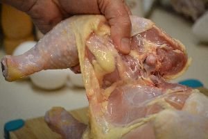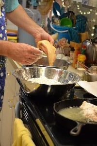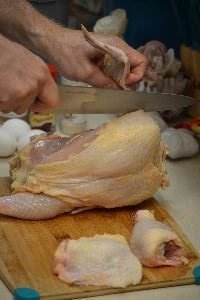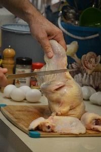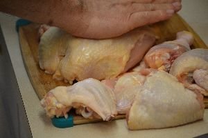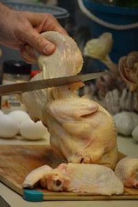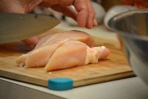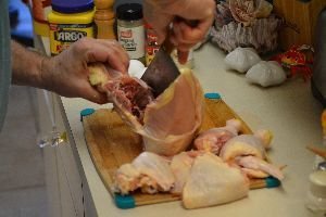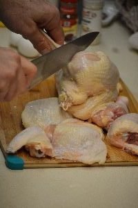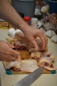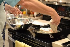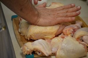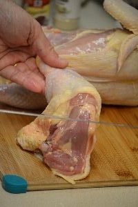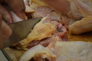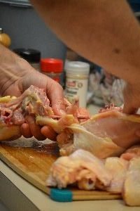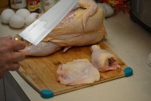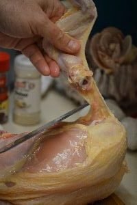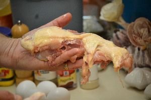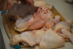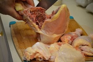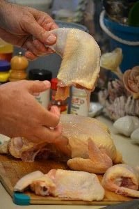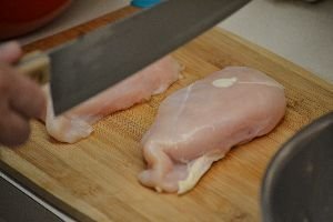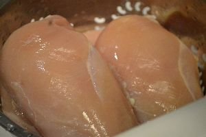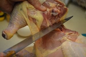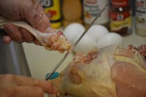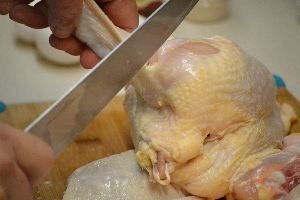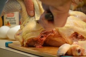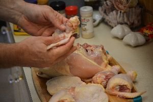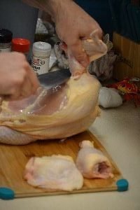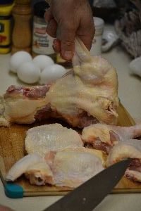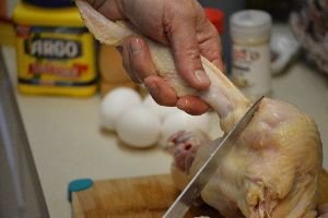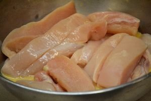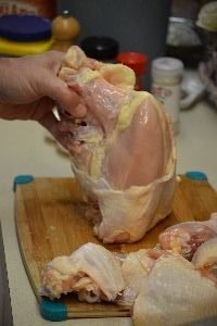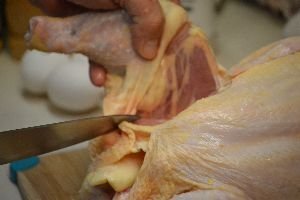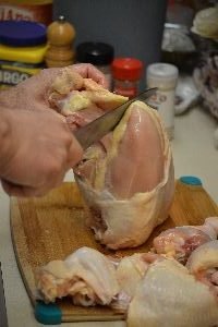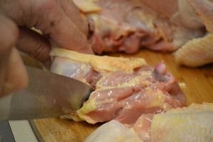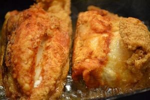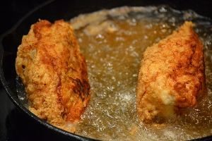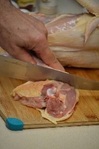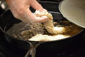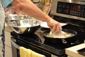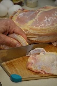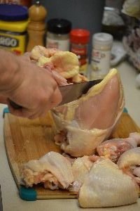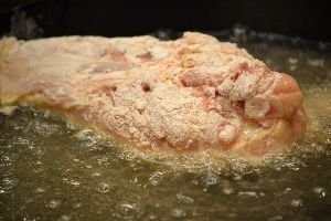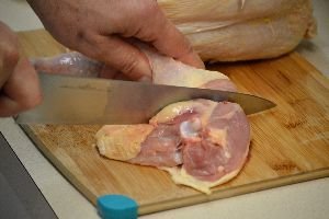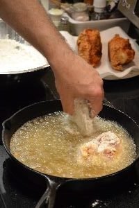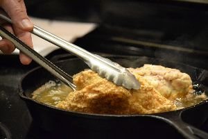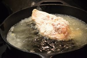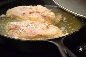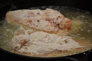 Gently place the large side of the breast into the center of the hot oil keeping the tip away from you. Now, ease the tip of the breast into the oil. Placing the breast into the oil this way keeps the hot oil from splashing on you.