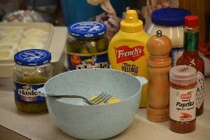 You do want to place the yellow yolks into a bowl and mash them up. You next want to start adding the ingredients. Mayonnaise, Yellow Mustard, Freshly Ground Black Pepper, several shakes of Tabasco Sauce, Sweet Pickle Relish, and a spoon full of Sweet Pickle Juice.