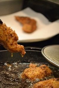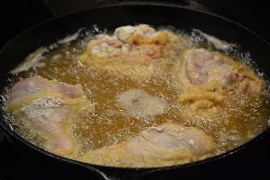 Repeat this for the other pieces of chicken being sure to not overload the pan, as that will quickly reduce the temperature of the oil causing uneven cooking.