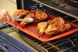 Turn your oven onto low and place the chicken on a cookie rack and sheet pan to keep the chicken warm until serving.