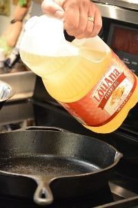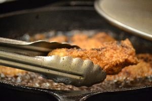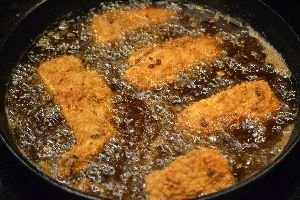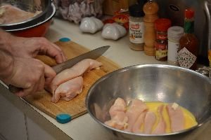 Carefully place some of your egg coated chicken strips into the heated oil being sure not to overcrowd your pan. 4 to 5 chicken strips is a good number to fry at one time.
