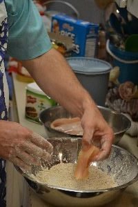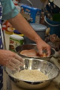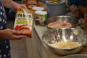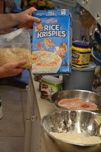 I, Julie, didn’t want the Chicken Tenders cooked in the same way as the whole chicken, from above. I got the idea to recreate the Extra Crispy Kentucky Fried Chicken recipe that was so popular from long ago, where they added corn flakes to the chicken to give it that extra crispy taste and texture when fried. However, we didn’t have any cornflakes so I rummaged in the panty and found the Rice Krispies cereal, and the Panko, and the French’s Fried Onions, and Jalapeno Onions. Viola! We have our CRISP!!!!