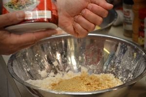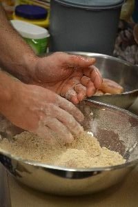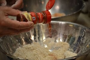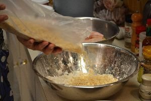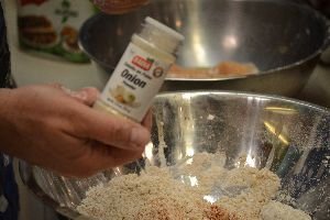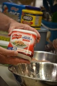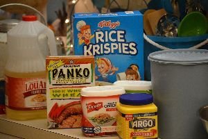 NOTE: We did one batch with just the Rice Krispies Cereal and Panko, and the PLAIN French’s Fried Onions, then we did a second batch using all of the ingredients that I mentioned, while adding the Jalapeno Onions. Here is what we did……