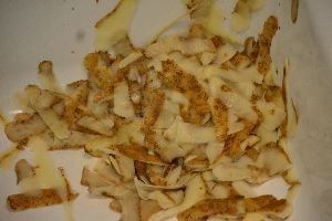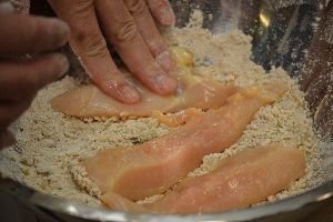 Now, place some of your chicken strips from the egg mixture to your new dry mixture and fry them as before.