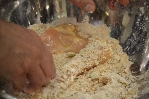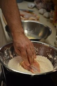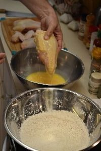 Once your oil is hot and ready to go, remove your sliced chicken breast from the egg mixture. Shake off the excess egg and then place it into the dry mix, coating it well. Have your splatter guard handy.