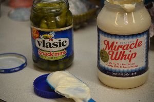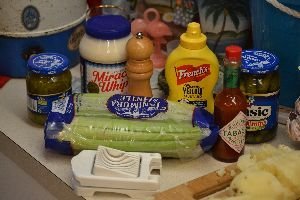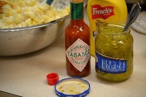 Next comes the Sweet Pickle Relish, the Tabasco, and the Pickle Juice