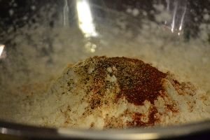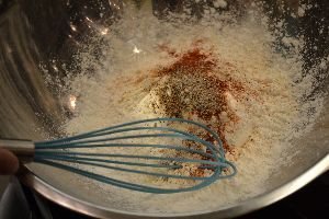 Once your oil is hot and ready to go, dip your bone in chicken breast into the egg mixture coating it well. Shake off the excess egg and then place it into the seasoning mix, coating it well.