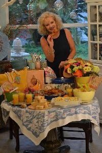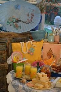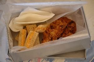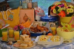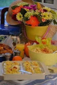 Fried Chicken, Pimiento Cheese Sandwiches, Potato Salad, Deviled Eggs, Sliced Cantaloupe, and always Orange Juice, always at the Florida Welcome Center. The new food item that we added here is a Tomato, Ginger and Honey Salad.