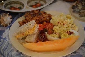 Fried Chicken, Pimiento Cheese Sandwiches, Potato Salad, Deviled Eggs, Sliced Cantaloupe, and a Tomato Salad.